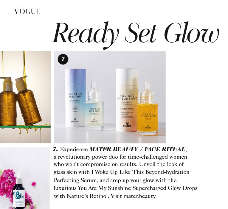 The MATER Beauty / FACE Ritual - I WOKE UP LIKE THIS Beyond-hydration Perfecting Serum + YOU ARE MY SUNSHINE Supercharged Glow Drops feature in June 2023 edition of British VOGUE.